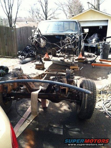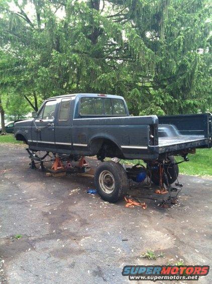 The first thing that the OP did with his F-150 was pull the bed and cab off, essentially removing the frame and replacing it with the stronger frame from the F-250. The heavy duty frame was from a long-bed truck, so he trimmed the frame to work with his F-150 short bed, bolting on the bed, cab and fenders of the half-ton truck.