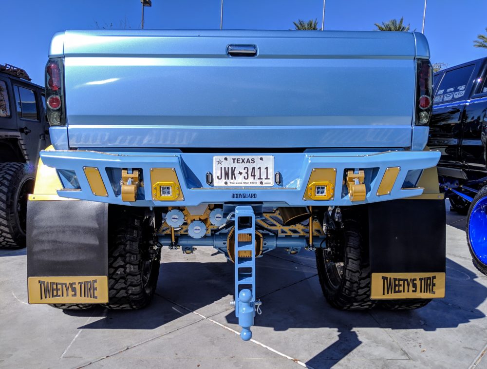 Since then, Rivera took his F-350 to the next level with Tweety’s Tire’s help once more, swapping out the red and white for blue draped in gold. The truck rides upon an airbag suspension (powder-coated in blue and gold, no less) paired with a set of big Fury Off-Road tires mounted upon gold American Force wheels.