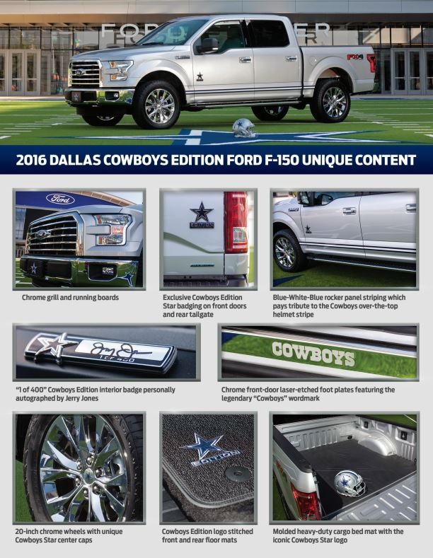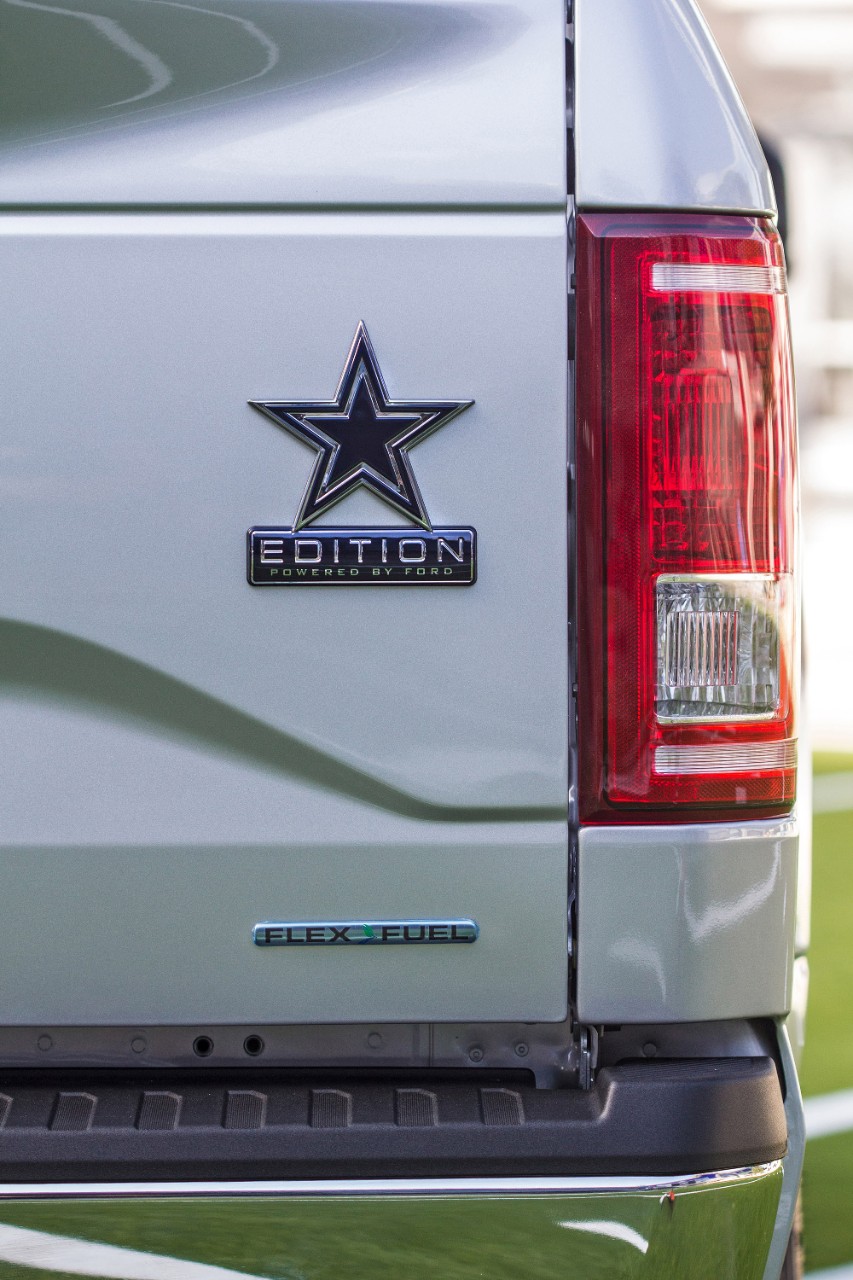 The 2016 Dallas Cowboys Edition F-150 is based on a Cowboys-helmet-silver F-150 XLT with the Chrome Package and comes with exclusive add-ons. Those include: