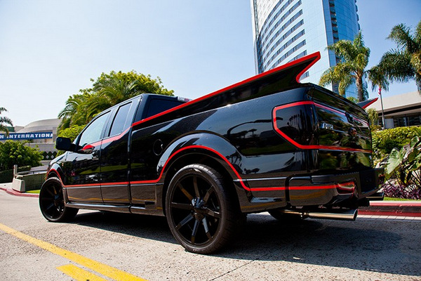 Dubbed “The Crimefighter,” the truck is a 2012 Ford F-150 customized by Galpin Auto Sports with a tuxedo black paint job and Ferrari red accents that create a look much like that of the original Batmobile. The bed of the Crimefighter has even been adorned with fins. It’s powered by a Ford 5.0-liter V8.