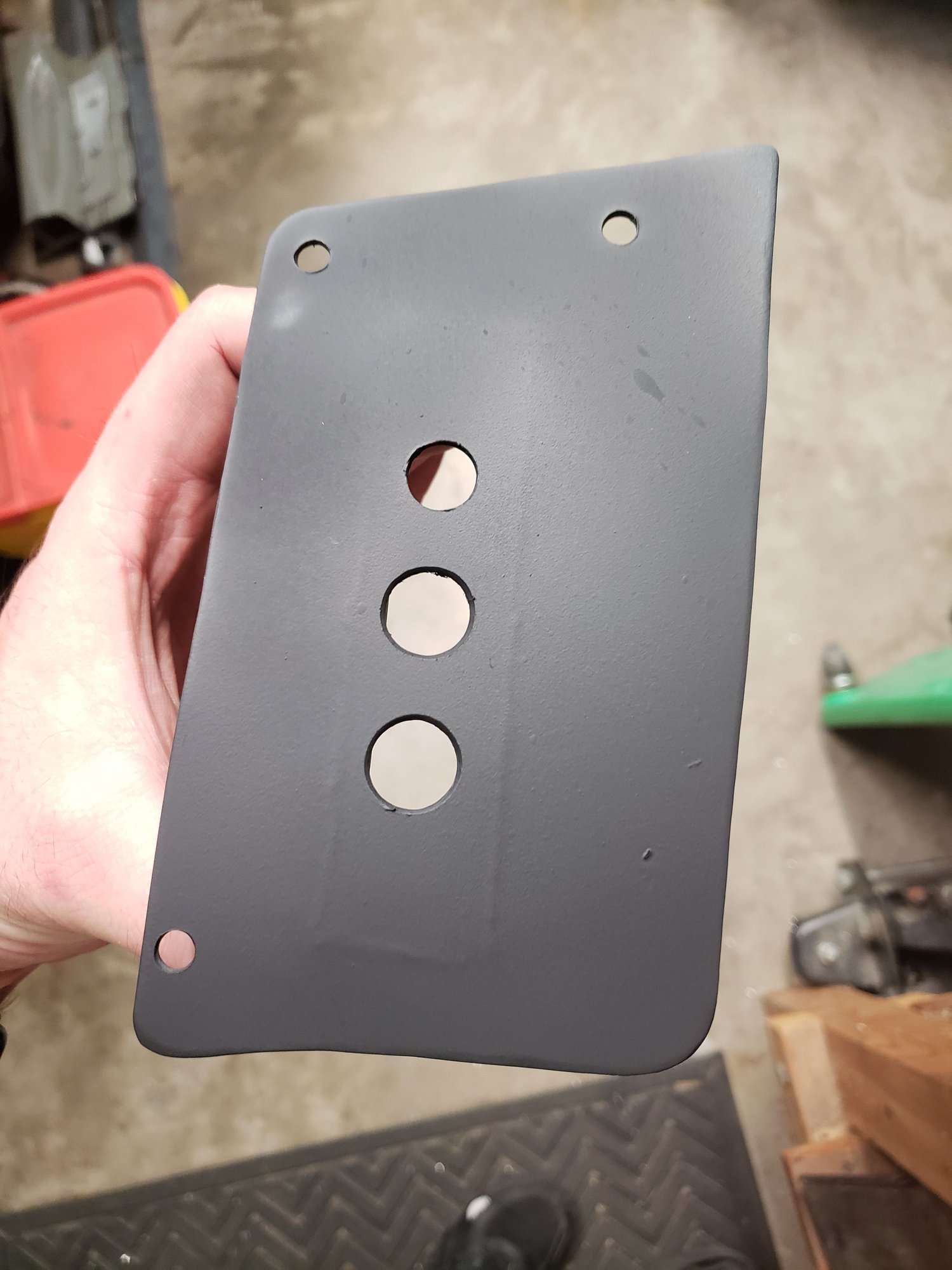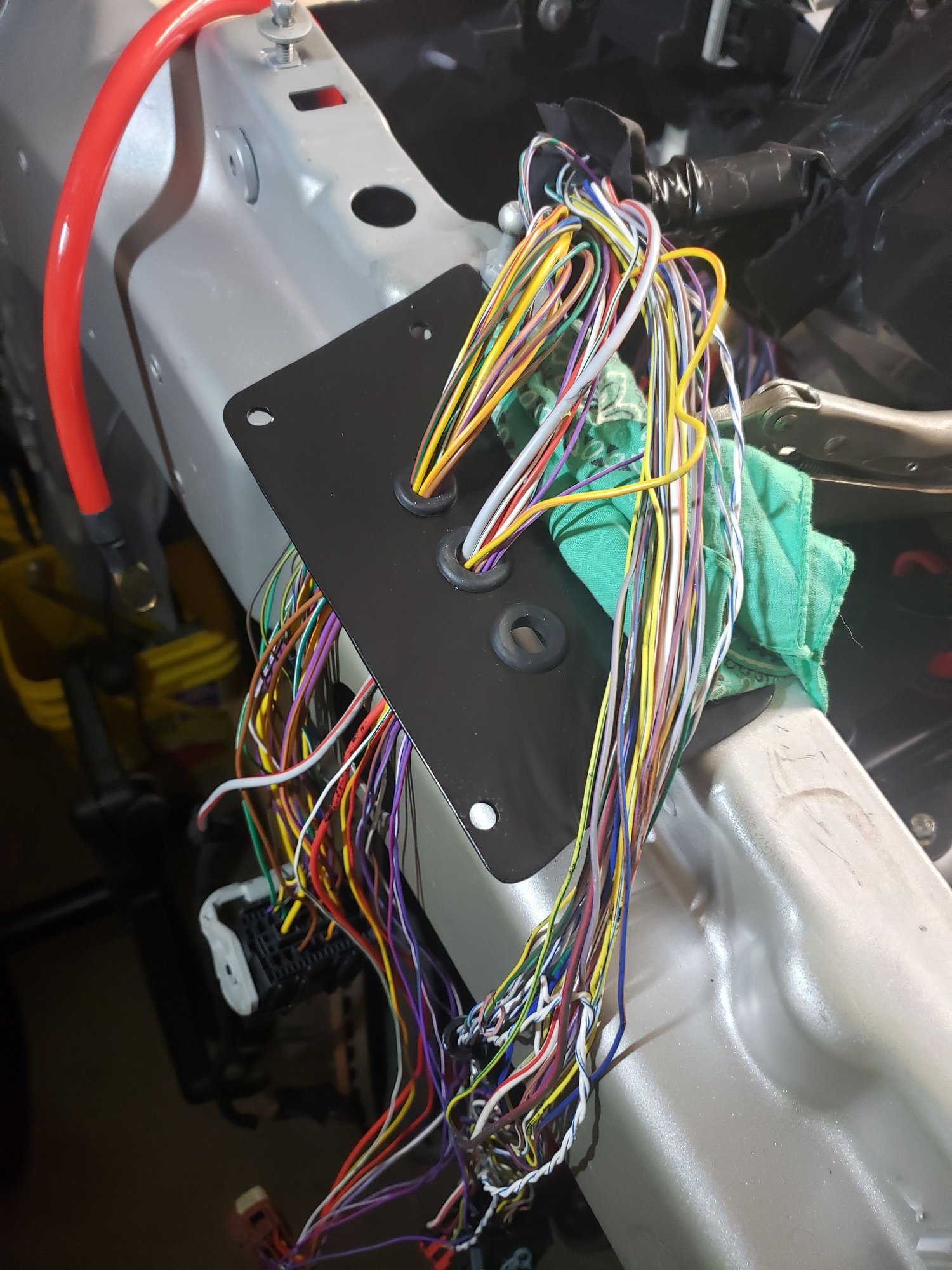 I know it doesn't look like much, but I now have 9 hours in fabricating this plate, and the associated wiring with the plate. Depinning the 59 pins in several different connectors, and routing the harnesses through the two grommets