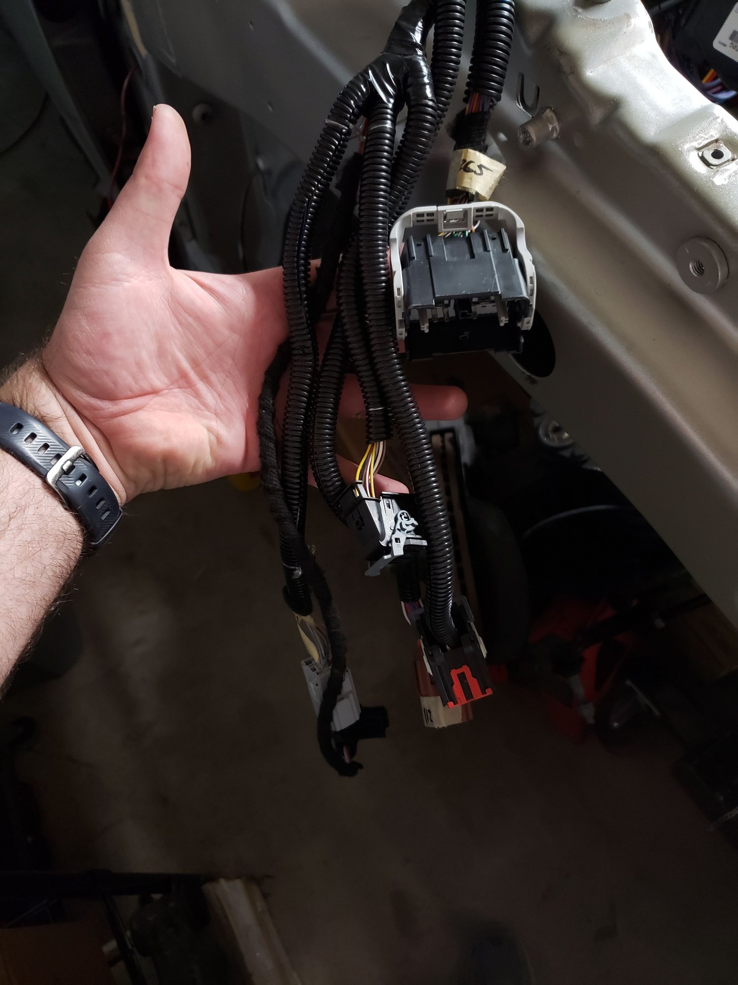 This is the body harness going into the cab on the passenger side. Will have to de-pin these connectors to push the wires through the grommets