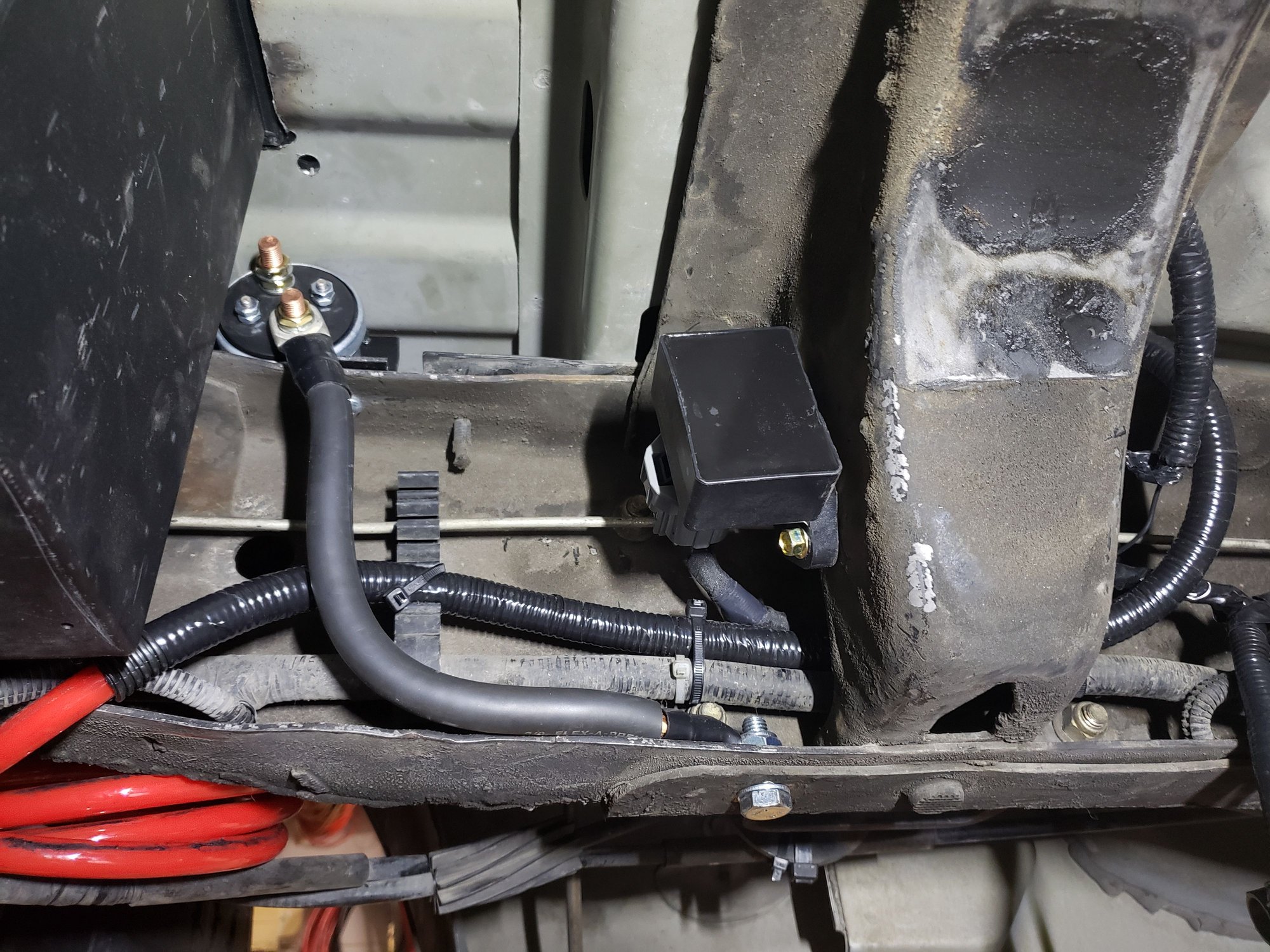 Power wire taped and routed over the frame just behind the leaf spring hanger. Getting close