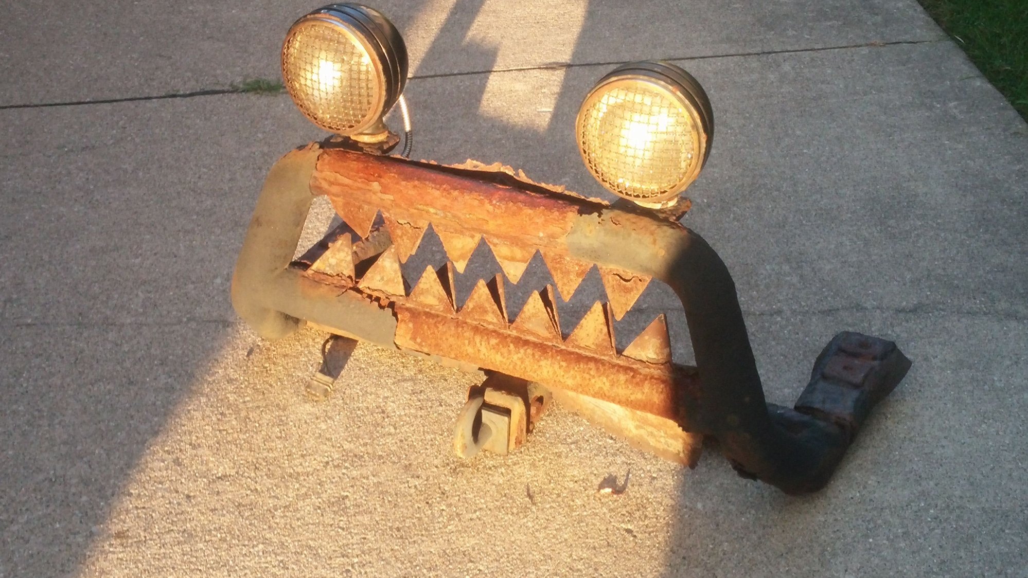 So on my '03 Screw, I welded up my own bull bar, from schedule 80 steel pipe. Then I could weld in a receiver tube to mount either a hitch, a hook, or a pusher. I kept my hook bolted in there so I could wrap a sling on it and pull people out of snow banks. I even slanted the sides to follow and mirror the grille's shape and profile. Then I put teeth and flood lights for eyes, making it look like an A-10 Warthog. Quite approved by all.
