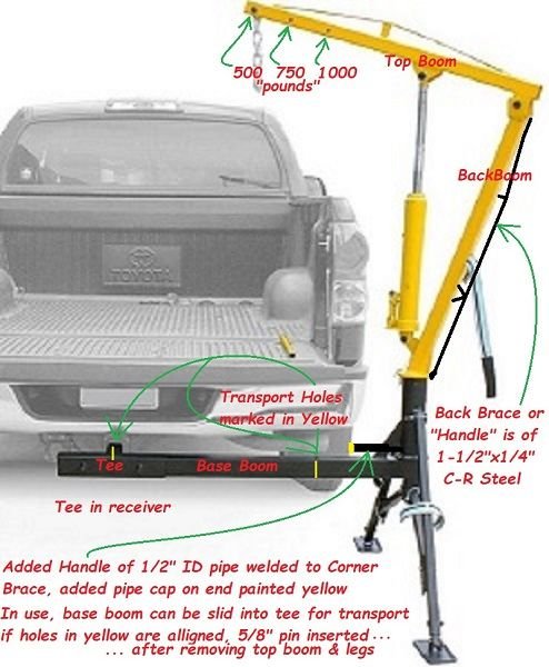 I've added some hand holds for the main upright in the form of a back brace kind of like the one on top boom, except it ties into the thick steel base at the bottom. Used 1-1/2" x 1/4" cold rolled steel. I also added a carry handle for the lower black boom that attaches to the tee coming out of the receiver, welded to the corner brace after slotting the 1/2" ID black iron pipe. Added some tape. I know, some will say "ruined the warranty", maybe so, but sure will aid handling. I did not support this handle at both ends, it's pipe, it's stout enough, and it clears the hitch "Tee" adapter when pushed all the way in to it to insert the pin in the transport holes. The boom or top arm is marked for 500, 750, or 1,000 pounds. It does NOT use a interior sliding beam like most shop cranes, it is set up so you pull a bolt and move the chain & hook itself.