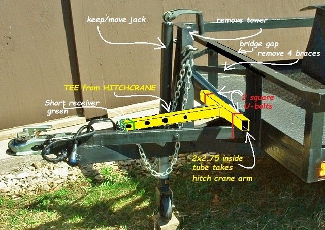 This is a picture of my trailer, it's heavier than it looks. It has 2,500 pound each leaf springs, a 3,500 pound axle with a 4" drop built in, and the main frame is of 1.5" deep x3" tall x1/4" wall C-channel, then a near 1/8" thick steel diamond plate floor, and on top of that is a 2 x 2 x 1/8" channel perimeter and railings. It has 6 crossmembers under the floor. In the picture it has 14" wheels & 235/60-14 tires, I have some 15" alloys with 235/70-15 LT tires on them in the shed. The plywood was some left over stuff I ripped and zip tied in place to haul mulch one time, it was heaped up higher. The tongue is longer now, at near 54" ... but I'm going to put back like it was as in this picture about 32" long. The bard is 49" wide x 96" long, the rear is removable to accept wider loads ... like a trike. The shortening and removal of the tower and braces will make a lighter tongue lift. There is a "tower" which also serves as a holder for the tongue jack, but I'm going to remove the tower and 4 braces and remount the jack as removable or to swing up. Below is a picture with a drawn in "TEE" (in yellow) as used with the HITCHCRANE I'll weld a short receiver on the tongue, and use two square type U-bolts at the cross piece which accepts the 2 x 2.75" hitch crane's main arm. I'll use a standard 5/8" hitch pin at the front. This will allow me to pick up loads and swing into the bed with ease. I will also bridge the opening in the rail intended for the trike's front tire.