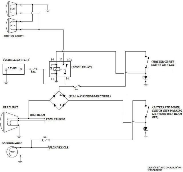 As promised, here is a schematic of the way i wired up my lights. It allows for the driving lights to come on automatically with the high beams, and utilizes a switch to turn them off (as normal kits are designed for), i also incorporated another switch to be able to turn them on any time i wanted to as long as the the parking lamps are on. I did this by utilizing a bridge-rectifier as a non logic "or" gate. as longs as one of 2 conditions are met while the master switch is on the driving lights will turn on. Using a bridge rectifier allows this to work without back feeding voltage to the high beams if the lights are on manually and vice versa if the high beams are on. If anyone has any questions feel free to ask.