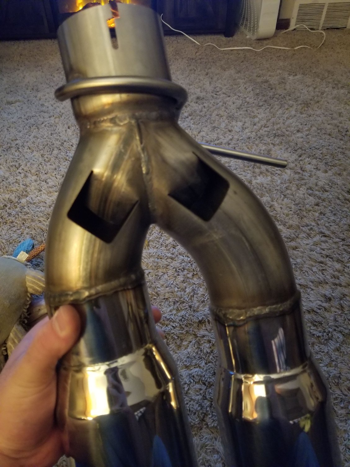 I'll attach pictures of the new one they sent and the part number. The only change I can tell is a vent on the bottom side of each pipe after the Y in the tip.
