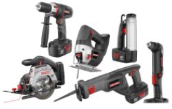 The P860 Combo kit includes the P201 cordless drill with magnetic bit holder and 2 bits, P500 circular saw with carbide tipped blade and edge guide, P510 reciprocating saw with 2 blades, P520 jigsaw with 2 blades, P400 sander with sandpaper and scrubbing pad assortment, P710 Tuff Sucker™ wet/dry vac, P700 flashlight, 2 rechargeable battery packs, 1-hour diagnostic charger and tool bag.
