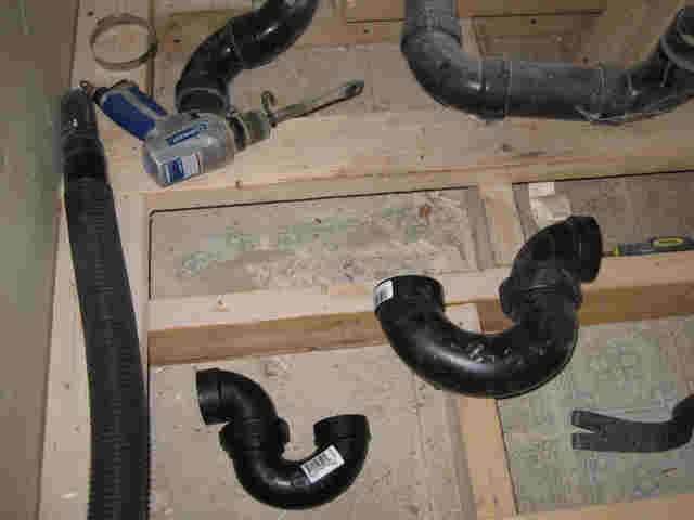 Sorry for the picture quality, I dont know what corel draw is doing to my image. Upper left is the current connect point. Upper right is what was connected. Obviously you can see both p-traps I'm digging in the center square and currently have a hole probably 2.5 wide, 2 deep, 6 long. I'm going to have to find a way to go at least 3 inches further down for that trap. The only other possibility is to go down another inch and ditch the 2x4 between the hole and the rest of the plumbing. Then the water would have to go down into the ptrap, back up out of the ptrap, down into the plumbing, then up just a little at the top of the image. The base of the drop in shower sits on the 2x4s.
