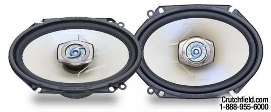 They are 6 x 8.(corrected) Pioneer make some good 3 way for the doors. Behind the seats anything goes. I took out the worthless box, moved the cd changer under the seat where its easy to change the pak and put bose 401 three ways and a 200 watt 4way amp back there. Many have put mega bases behind the seats.
