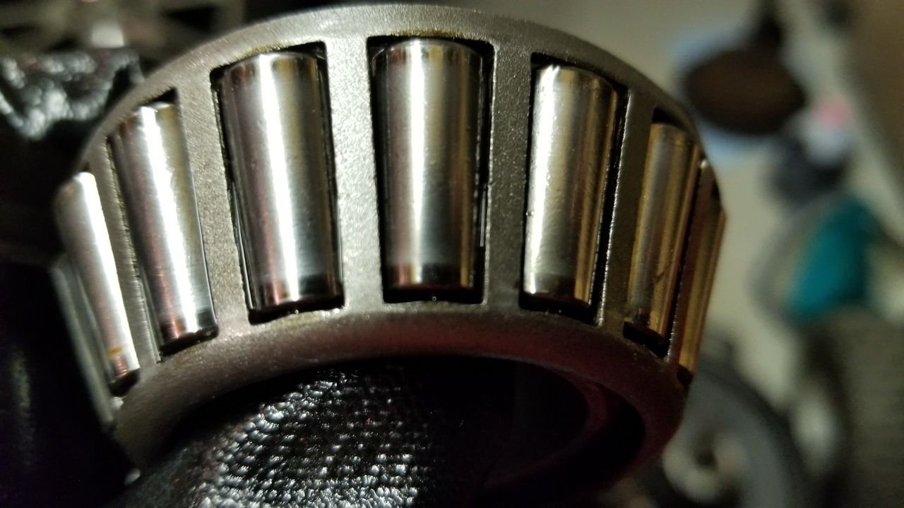 Pulled the differential apart today and it looks like pinion bearings are bad. All other bearing and races didn't look bad, so I'm thinking of just replacing the pinion bearings and setup. Once I had the carrier out and could spin the pinion, it felt like it was crunching to the point it didn't pay to check preload for a reference. Pinion didn't show much wear on it. Just waiting on parts now... Inner cup Inner cone Outer Cone Outer Cup