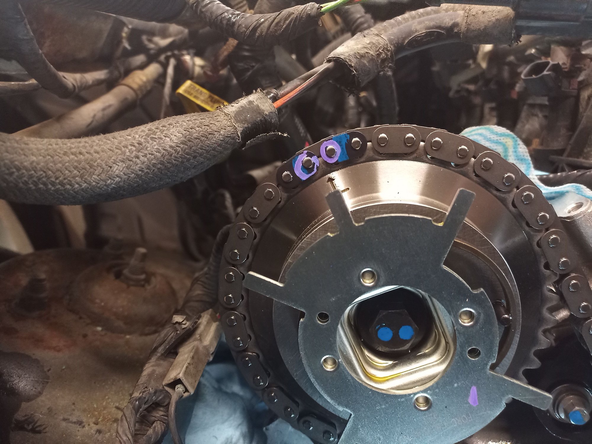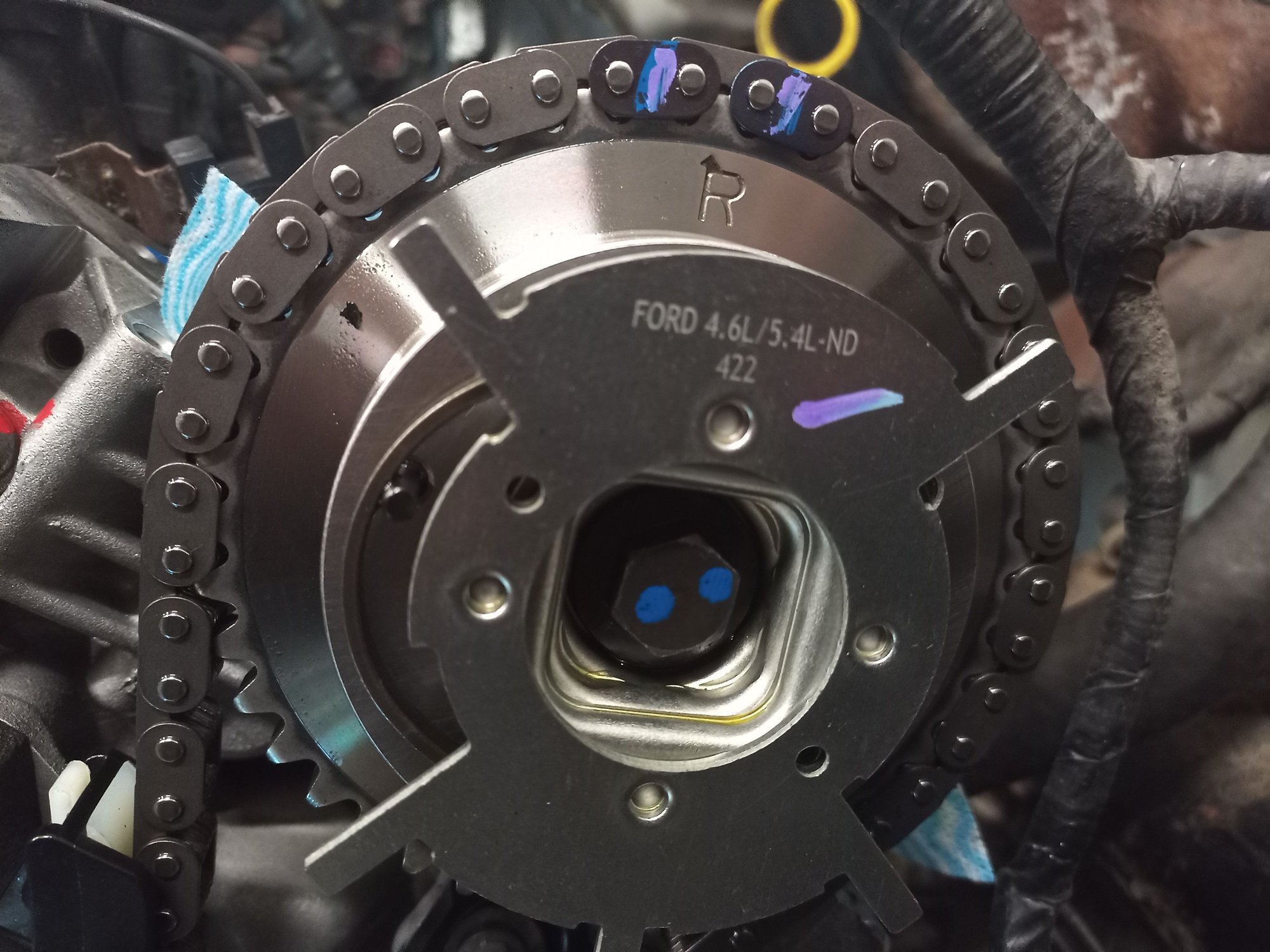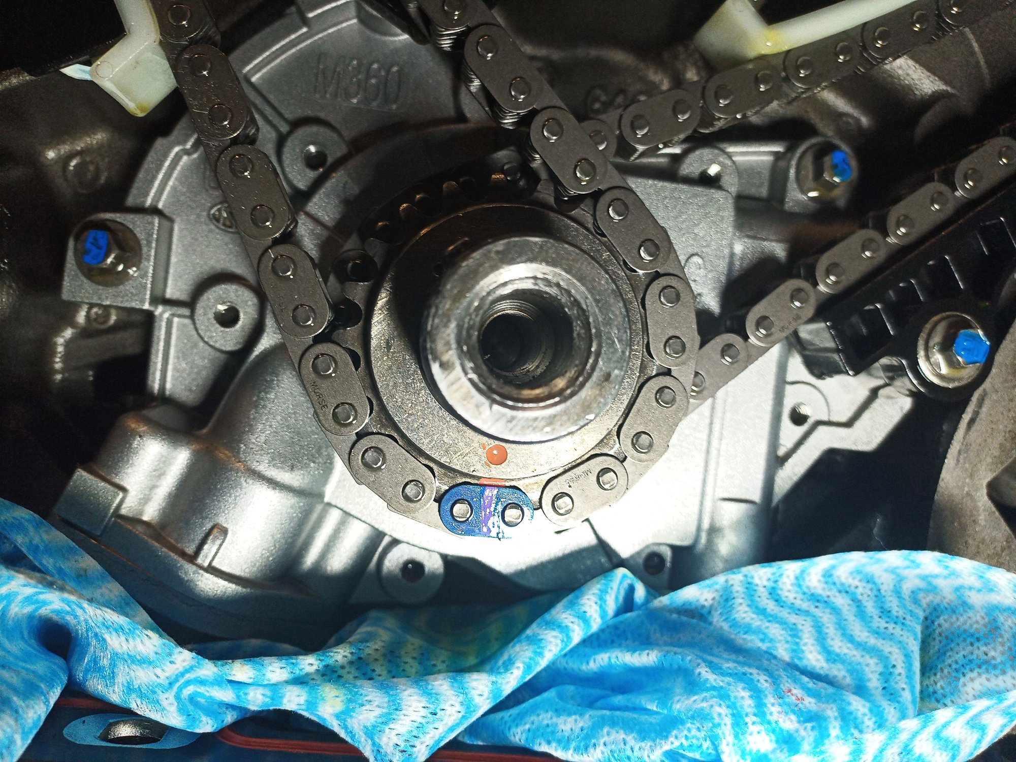 Supplier indicated that I must have knocked timing out by rotating engine backwards. I don't recall doing that, but I took their word for it. The timing was indeed off. I re-timed and took these photos of the timing marks. Started it up after reassembly and still running rough and leaving codes P0012, P0016, and P2196.
