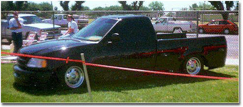This is Californian, Ryan Konkol's AWESOME '97 F-150. Following is a list of mods... the truck rides on a set of 16" Centerline Sabres with 245/50,16 of front and 255/50,16 in the rear, it is lowered with 4" lowered control arms, new leafs springs, 4"shackles, 5" drop hangers, and air bags on all 4 corners. As if that wasn't enough...e ground.with the on board, he has installed a Panasonic CD player along with 2 Rockford Fosgate amps, and driving 2 - 15" JL Audjo W4 subs and an assortment of other Cerwin Vega mids and tweets. The truck was in the shop for 2 months getting shaved and painted. including shaved door and tailgate handles, emblems, antenna, tail lights (he added custom lights in the roll pan and shaved front bumper too). The truck is painted with 4 coats of Glasurit jet black paint water sanded to a perfect mirror shine. Clearly, Ryan loves to show off this truck...and who can blame him?? |