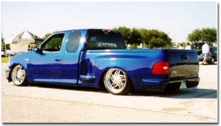 Check out this slammed F-150! Now that is low. This '98 belongs to David Shulman. The lowering job has been achieved with airbags all around. In addition to the slam, it features a Snugtop tonneau, Sir Michaels roll pan, Trenz billet inserts in the grille and bumper, and some interior billet pieces. If that's not enough, its also got billet pedals, sill plates, instrument cluster billet overlay on top of white face guages, carbon fiber dash kit, and a full stealth stereo system. Perhaps we can get an in depth feature on this truck some day. |