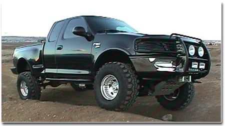 Looking to have some fun offroad? Looks like Tyler Warren is! His '98 F-150 is set up just right for it, with a 4" Pro-comp suspension lift, 2" body lift, 36 x 14.5 Radial TSL Super Swampers on 16.5 x 10 centerline wheels, Pro-comp skid plate and lights, Superchips chip, Airaid air system, dual Optima batteries, ARB air lockers front and back, 4.56 gears, Warn 9000i winch with the hidden mount and dual exhausts out the back. |