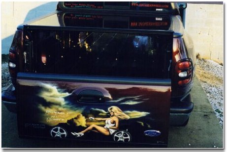 (updated 11/30/98) This gorgeous '97 F-150 belongs to Benny Joe Bryant. In addition to the airbrushed mural on the tailgate (inset), this truck features a rear vision camera, VCR , theatre setup, a clean lowering job, billet grille and an oak bed. We can see why it was recently featured on Trucking Times website as their "Truck of the Month." Nice work, Benny Joe!! |