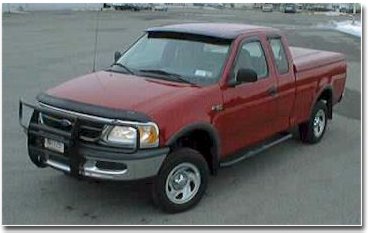 You may see Nic Colasurdo's '97 F-150 when driving through Rochester, New York. His 4x4 sports a Ford bed liner, Ford Step Shields and a color-matched A.R.E. L-series hinged fiberglass tonneau cover. In addition, this truck has Graboski rubber mud flaps, gloss black TruckTech nerf bars, smoke tinted window Ventvisors, Lund Screen Fronts, Lund Lunar visor, a Warn Trans4mer grille guard with light bar, headlight brushguards and a "Shelf-It" overhead cab organizer. Believe it or not, soon to come are BF Goodrich 285/75R16 All-Terrain tires and a custom auxiliary-light wiring harness & controls for a slew of auxilliary lights! Keep your eye on this truck... |