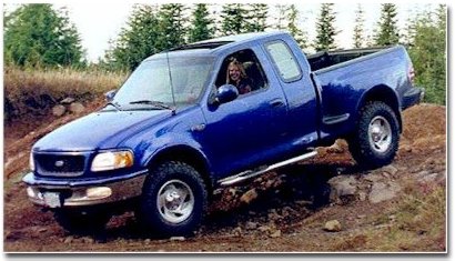 We continue with the blue theme with Martin Burlus' Flareside. In addition to the off-road package, it is outfitted with Mickey Thompson 34" tires, a large moon roof, power chip and all options except leather. By the way, that's his girlfriend Laura driving. |