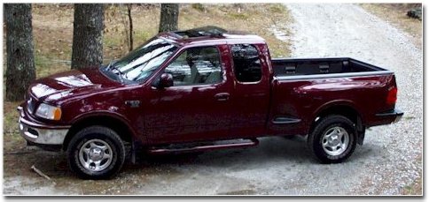Bruce Merrill of Cashiers, NC sent me some great pics of his 1998 F-150. Included in them were shots of the audio system installation that look terrific. I chose this picture because it shows the power sunroof. In addition, Bruce has added, Westin step bars, wood trim dash package with matching shift knob, cloth seat covers, a remote radar detector built into the dash, bedliner, PIAA Pro 90 fog/driving lights, Magnaflow exhaust system, K&N air filter, and a seriously upgraded stereo - consisting of a Sony Mobile ES CDX-C910 head unit controlling a Sony CDX 91 changer feeding a 6 channel ADS amp. MB Quart speakers all around, with the exception of the two subs, which are 8" a/d/s models. Nice truck! |