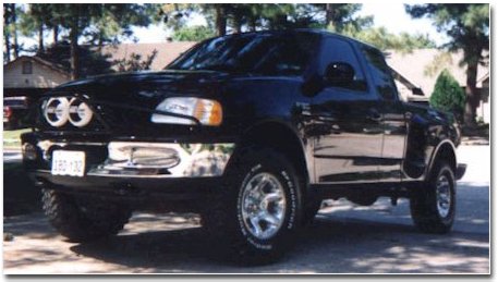 If you're around Houston, look out for Sean Goltz of Spring, TX. When he drives up behind you in his black '98 XLT 4x4 Supercab Flareside you will know it. His truck is extremely trick with the (requisite) K&N filter, 16x8 American Racing Atlas rims wearing BF Goodrich 285x75x16 Mud terrain tires and custom made prerunner with 2 Explorer Pro-Comp 130 series off road lights. As if that weren't enough, the truck also sports a Borla exhaust, tinted windows and Rockford Fosgate 4600X amplifier. The next project is a Trailmaster 4-6 suspension lift paired with 315x75x16 BFG's. For a limited time, there are some more pictures at his brother's page at http://www.rpi.edu/~goltzm/. They are still entertaining names for this truck (Mudweiser was a possibility), but I think Sean's girlfriend got it right when she called her "the other woman." |