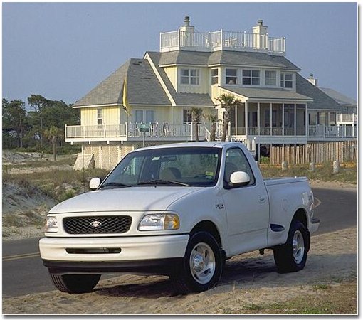 This F-150 looks like a picture postcard, so I could not shrink it down at all. This was taken by Larry Fajkus, while on a recent trip to St. George Island, FL. His truck is a '98 STX, with Gibson single exhaust catback, Superchip and Snug Top snuglid. Wow! That is nice!! |